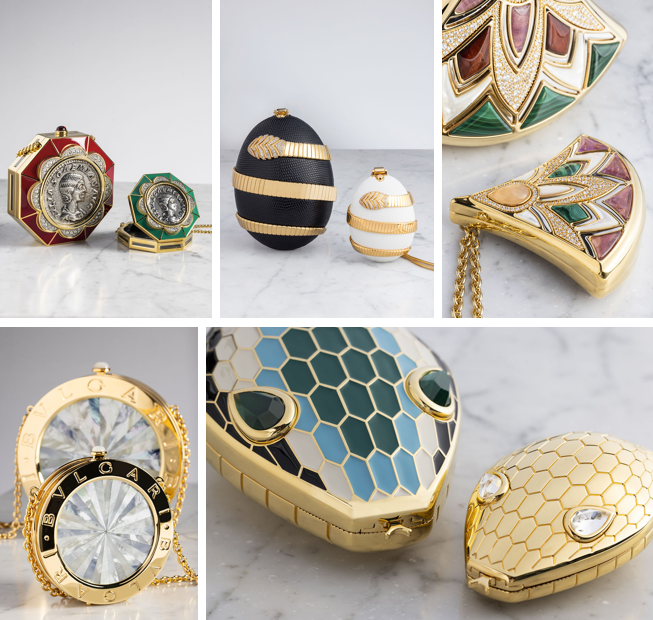 每款BVLGARI ICON Minaudière包袋皆以当代视角重新诠释宝格丽典藏,在历史传承与当代表达之间持续对话。其中,Monete系列晚宴包以全新比例诠释古罗马钱币,并饰以精美珐琅装饰,旨在向品牌经典的Monete设计元素致敬;Tubogas系列晚宴包采用珍贵蜥蜴“蛋”造型设计,其上蜿蜒缠绕着一条以纯金属打造的灵蛇,借此礼赞大自然的生命力;Divas’ Dream系列晚宴包则精心镶嵌瑰美宝石,以回溯这一经典符号的灵感本源——罗马卡拉卡拉大浴场(Baths of Caracalla)的马赛克图案;BVLGARI BVLGARI系列晚宴包以现代美学为基调,采用圆柱形造型并饰以手工珍珠母贝嵌花元素;而Serpenti系列晚宴包则对宝格丽Serpenti系列珠宝与腕表作品中颇具辨识度的蛇首造型进行创新演绎,将其化为一件独立的作品。