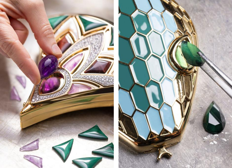 值得一提的是,宝格丽将高级珠宝制作工艺引入到了配饰之中——采用失蜡工艺,精准雕琢出富有雕塑感的立体造型,并融合手工珐琅、手工镶贴与密镶技法,将紫水晶、虎眼石、珍珠母贝及孔雀石等彩色宝石巧妙嵌饰于包袋之上。此外,每件作品均配有呼应其灵感本源的精致链条,且在搭扣处镶嵌一颗凸形蛋面切割宝石,将实用包袋化作可随身携带的艺术作品。
